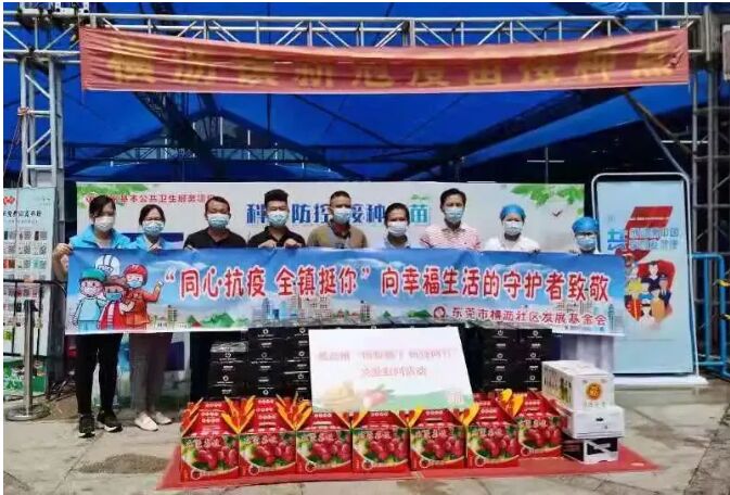 6月12日上午,东莞市横沥社区发展基金会邓志华会长、温国枝副会长一行来到横沥镇新冠疫苗接种点进行暖心慰问,将水果及35箱爱心饮料送到抗战在一线的医护人员、后勤保障人员、安保人员和志愿者手中,并叮嘱他们要注意劳逸结合,合理安排工作和休息时间,做好自身防护措施。