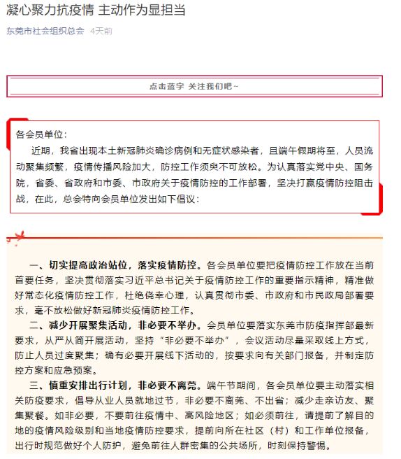 东莞市社会组织总会向会员及时发出《凝心聚力抗疫情,主动作为显担当》一文,倡导会员单位响应有关单位关于疫情防控工作的要求,并提出“切实提高政治站位,落实疫情防控”“减少开展聚集活动,非必要不举办”“慎重安排出行计划,非必要不离莞”“充分发挥行业优势,积极宣传正能量”等倡议。