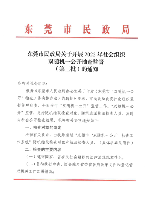 东莞市民政局关于开展2022年社会组织双随机一公开抽查监督(第三批)的通知