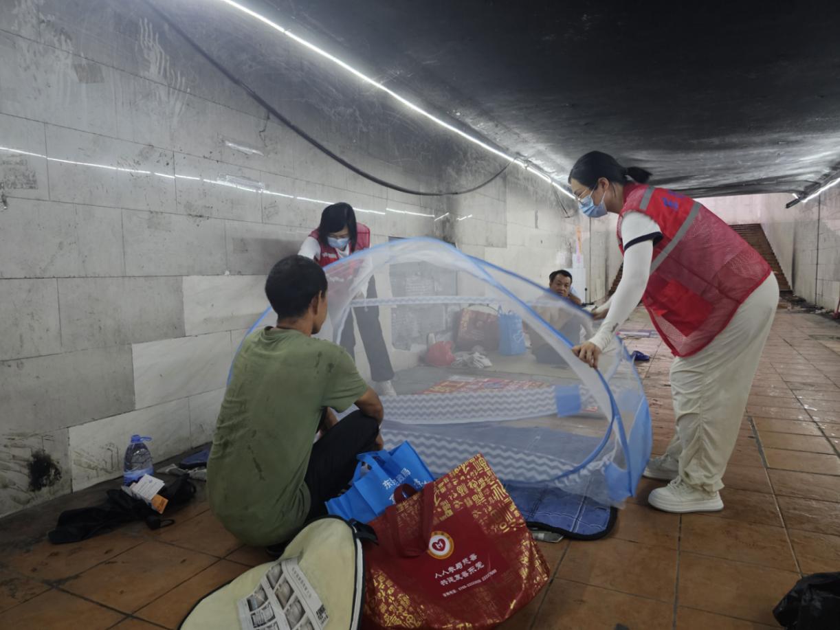 为流浪人员打开蚊帐做好防蚊措施