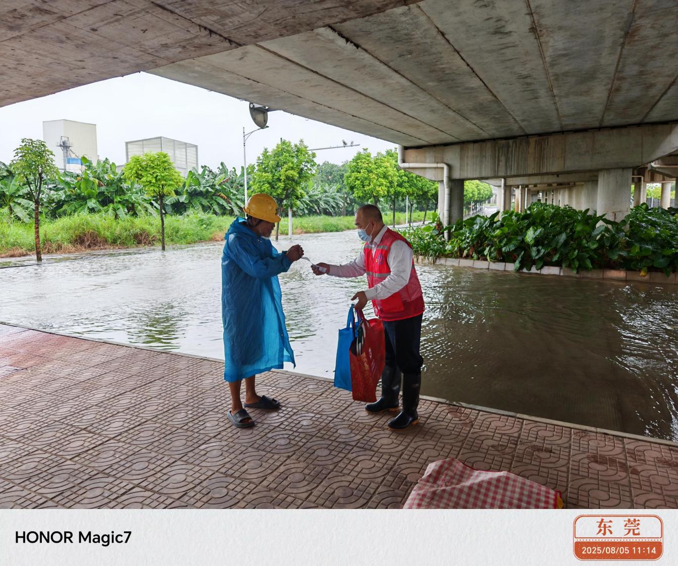 “大叔,雨太大了,涨水啦,这里不安全,跟我们去救助站吧。”工作人员耐心对一位流浪老人进行劝导。老人十分感动,接受了救助物资,表示自己会前往高处避险。