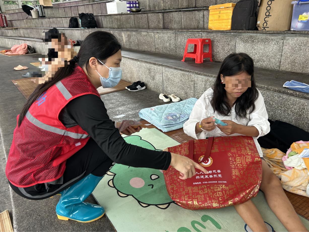 在此次防汛防蚊专项行动中,共有75名流浪人员收到由东莞市慈善会捐赠的“防蚊爱心包”。市救助管理站和各镇街公共服务办工作人员、志愿者冒着暴雨穿梭在各镇街的街头巷尾、桥梁涵洞,走遍每一处流浪人员可能栖身的角落,耐心劝导流浪人员进站避险;对于不愿进站的流浪人员,工作人员送上“防蚊爱心包”,耐心地讲解防蚊物资的使用方法和注意事项。同时,根据流浪人员需要送上食物、饮用水、防暑药品等物资。行动中,覆盖全市32个镇街(园区),救助108人,劝导2人入站,发放救助物资184份(防暑物资67份、防蚊爱心包117份),粘贴“两热”防疫宣传海报23张,派发救助指引卡片64张。