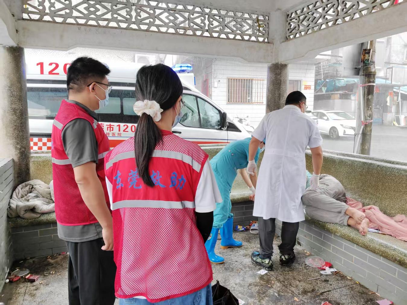 在石排利屋公园祠堂旁小凉亭,工作人员发现一名流浪人员癫痫发作抽搐,马上拨打120急救电话,医护人员到场紧急处理助其脱离危险。